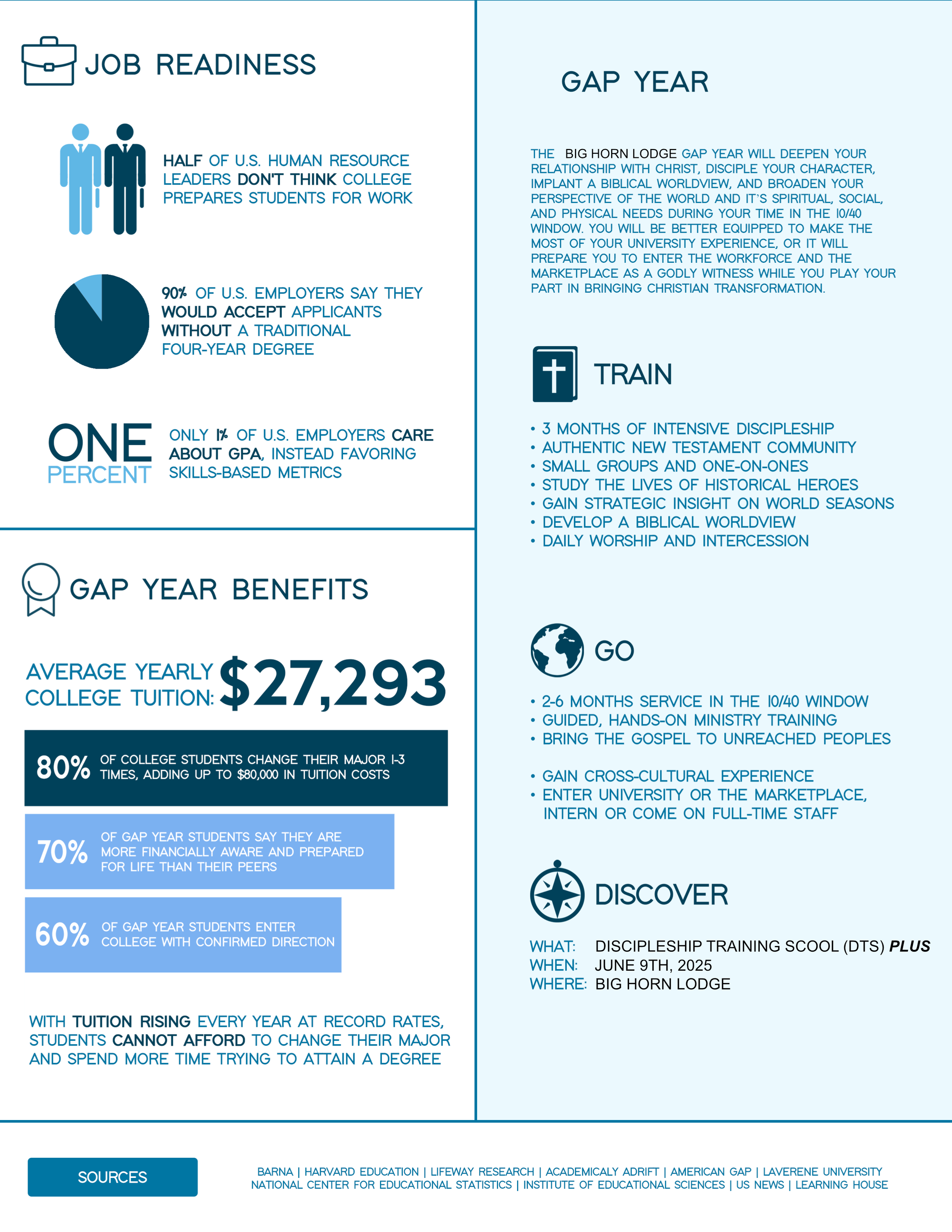 The Big Horn Lodge Gap Year Program is comprised of 5 months of intensive training plus 6 additional weeks of service and Biblical Worldview training. The first 5 months is comprised of a YWAM DTS focused on personal discipleship — with three months at Big Horn Lodge for Lecture Phase and two months overseas in an Unreached People Group for Outreach Phase. After returning from DTS Outreach Phase, you’ll have six more weeks of service and Biblical Worldview training.